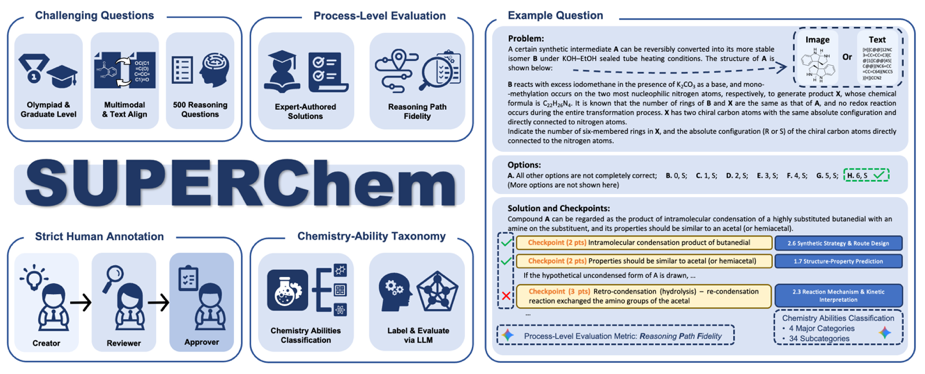 近日,北京大学化学与分子工程学院联合计算中心、计算机学院、元培学院发布化学大模型基准SUPERChem。该基准针对当前化学知识水平评测中题目难度有限、多模态与推理过程评估缺失等不足,系统构建了专注评估大语言模型(LLM)化学推理分析能力的新体系,旨在推动化学智能评测的深入发展。