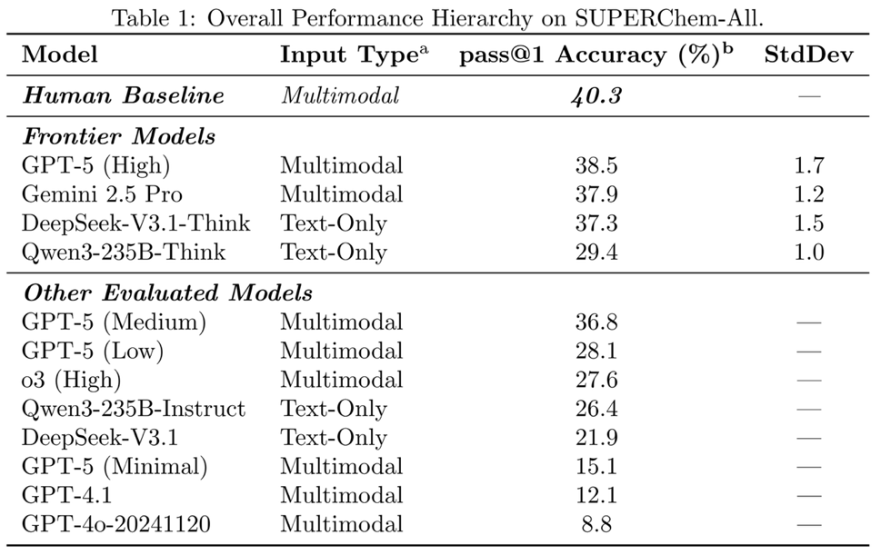 评测结果显示,SUPERChem具有较高难度与区分度。在化学专业低年级本科生闭卷测试中,人类准确率为40.3%。参与评测的前沿模型中,表现最佳的GPT-5(High)准确率为38.5%,表明其化学推理能力与低年级本科生水平相当,尚未超越人类基础专业认知。
