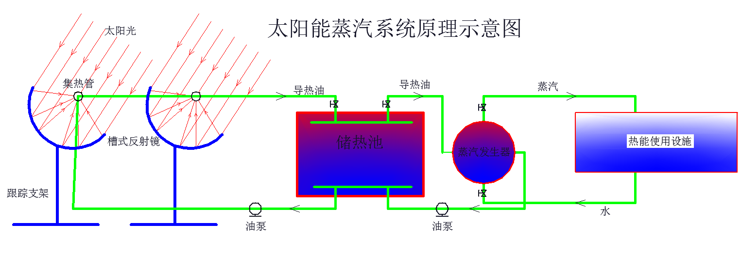 太阳能光热蒸汽系统原理如图所示。太阳光经过槽式反射镜(由跟踪器跟踪太阳光)汇聚到集热管上,加热集热管内的导热油,导热油将热能传递给储热池中的储热模块,需要产生蒸汽或热水时,由导热油将储热模块中的热能传递到蒸汽发生器或热交换器,产生蒸汽供给热能使用设备使用。系统的综合效率77%左右,按每平米800瓦(实际最高1000瓦)的直射太阳光能量计算,每平米集热器功率为615瓦。日照时间6小时,产生1吨蒸汽需要220平米。此教学系统设计开口3m,长6米,共18㎡。一天约产生0.1吨蒸汽或800kg85℃热水。