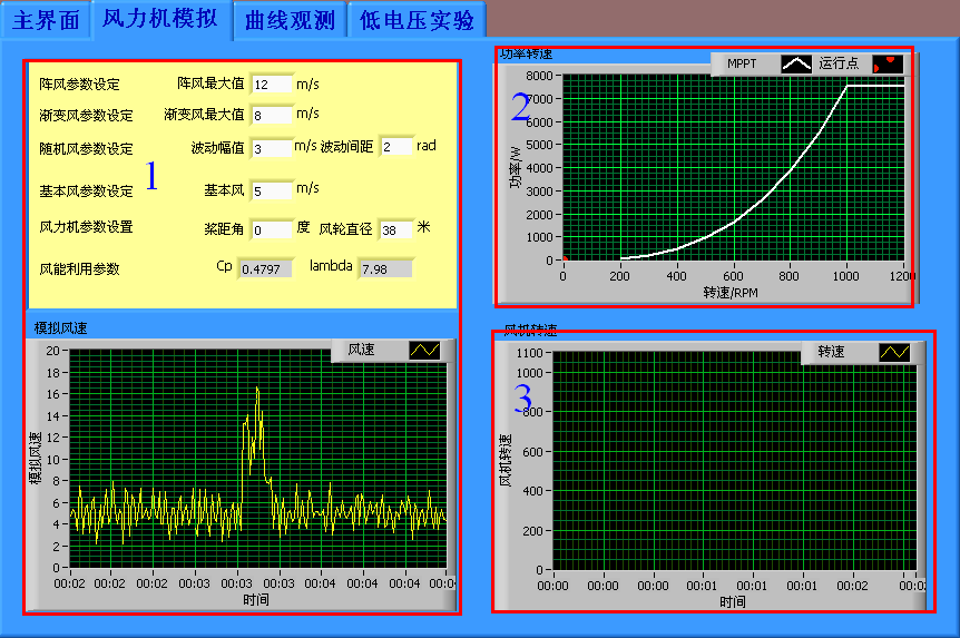 操作台功能包括:实验过程中的各参数变化显示、状态显示、能量转换的过程状态显示、外部风速、风向干扰设定。 |