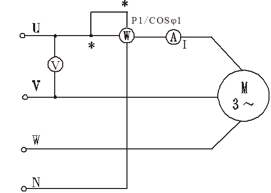 (2)用单瓦特表法测三相电路的功率,测量线路接线如下图所示,所测三相电动机总功率为P=3·P1。