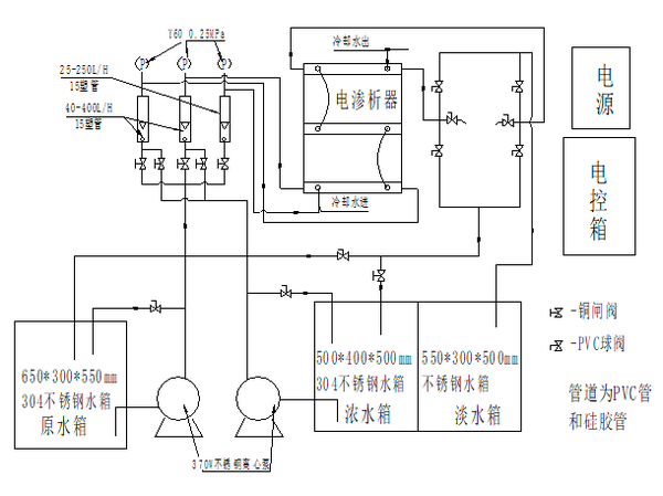 (4)电渗析器一台,采用异相离子交换膜和换向阀联动倒极方式。