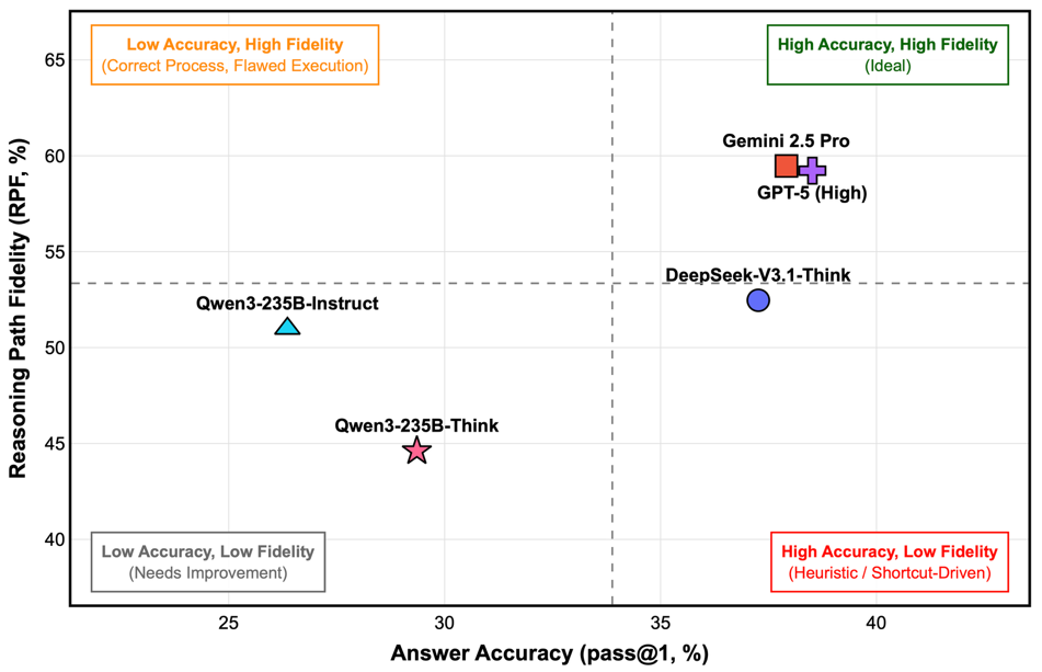 分析RPF指标可见,不同模型推理过程质量差异明显:Gemini-2.5-Pro和GPT-5(High)在取得较高准确率的同时,其推理逻辑也更符合专家路径;而DeepSeek-V3.1-Think虽然准确率相近,但RPF得分相对较低,反映其更倾向通过启发式路径得出结论。