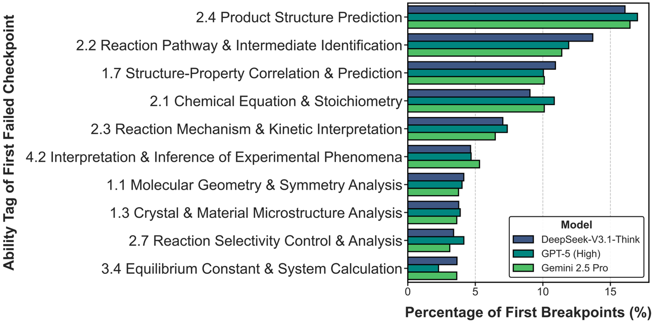 为进一步探究LLM推理失败的深层原因,研究团队进行了推理断点分析。结果表明,前沿模型的推理断点集中于产物结构预测、反应机理识别、构效关系分析等高阶化学推理环节。这反映出当前LLM在涉及反应性与分子结构理解的核心任务上仍存在短板。