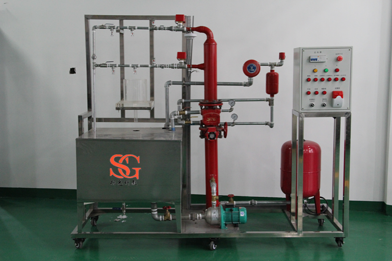 模型框架和水箱等主要部件全部使用不锈钢器件,保证不生锈、不易老化,可以模拟两层大楼喷淋灭火系统;模型系统主要由喷淋水泵、气压罐、湿式报警阀、水力警铃、延时器、压力开关、水流指示器、封闭式喷头、试验阀、火灾探测器、火灾报警器等典型喷水灭火设备构成,能生动模拟大楼内水灭火系统的典型结构。
