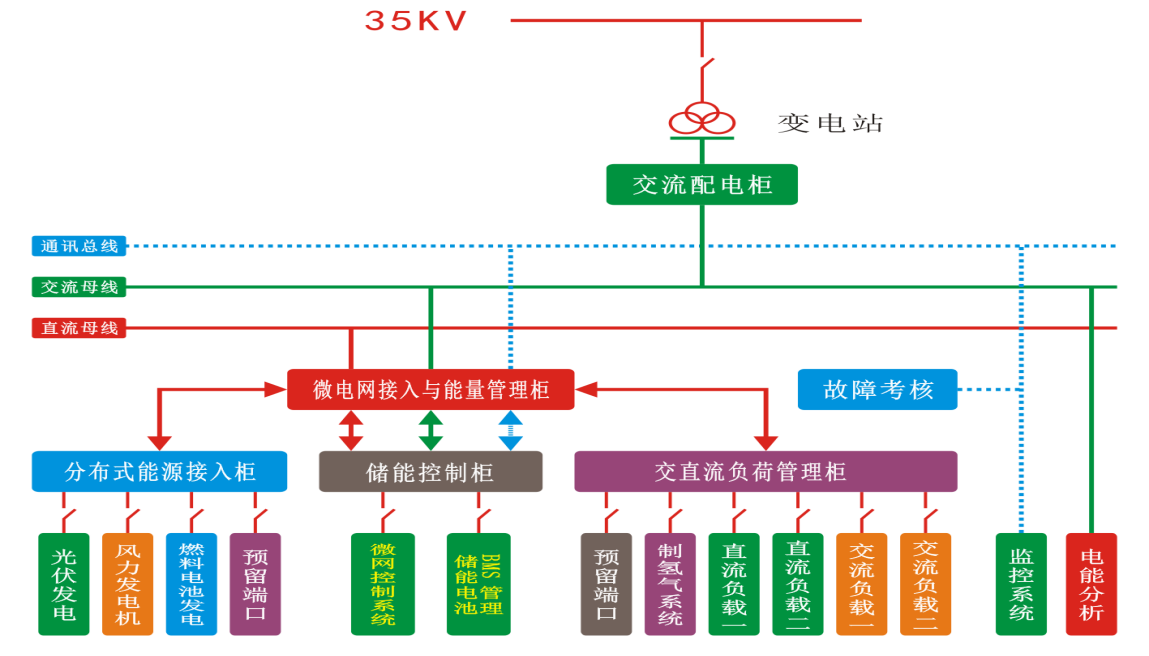 该系统采用交流+直流双母线结构,集成能量控制系统(PCS)、电池管理系统(BMS)、分布式发电系统(DG)、交直流负荷、能量管理系统(EMS)与监控系统(SCADA)等,实现清洁低碳、安全高效的源-网-荷-储协同优化功能。应用数字化、信息化与智能化能量管理系统控制,通过源源互补、源网协调、网荷互动、网储互动和源荷互动等多种交互形式,可以更经济、高效和安全地利用分布式新能源与储能,实现电能削峰填谷、负荷不间断优质供电、系统智能化保护与运行、自由离并网无缝切换等,从而实现发、用电效益最大化。