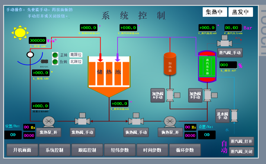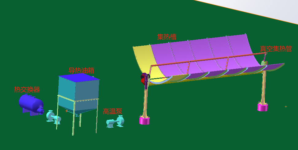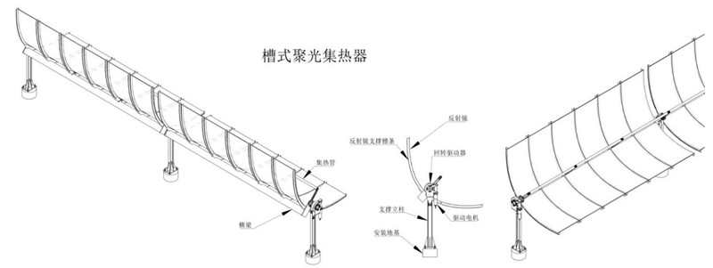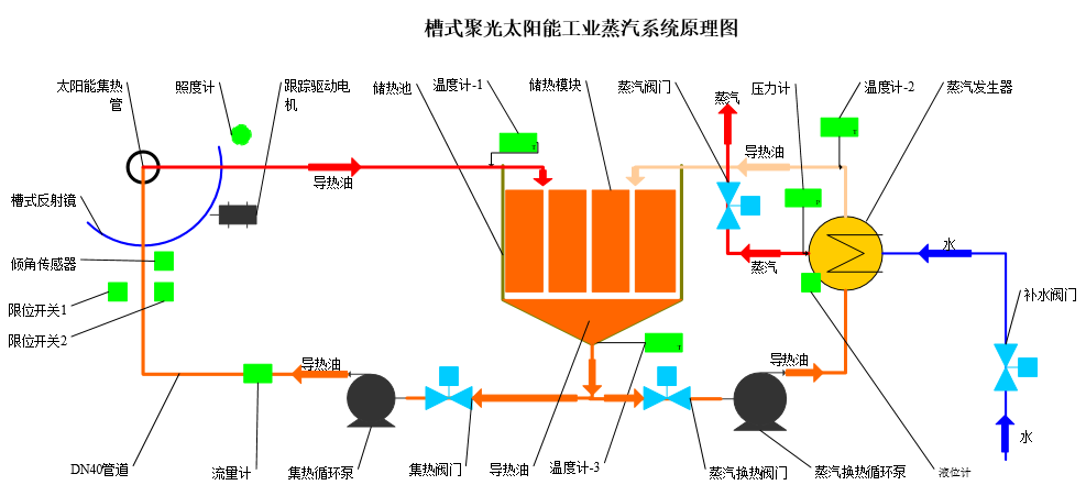 太阳能光热蒸汽系统原理如图所示。太阳光经过槽式反射镜(由跟踪器跟踪太阳光)汇聚到集热管上,加热集热管内的导热油,导热油将热能传递给储热池中的储热模块,需要产生蒸汽或热水时,由导热油将储热模块中的热能传递到蒸汽发生器或热交换器,产生蒸汽供给热能使用设备使用。系统的综合效率77%左右,按每平米800瓦(实际最高1000瓦)的直射太阳光能量计算,每平米集热器功率为615瓦。日照时间6小时,产生1吨蒸汽需要220平米。此教学系统设计开口3m,长6米,共18㎡。一天约产生0.1吨蒸汽或800kg85℃热水。