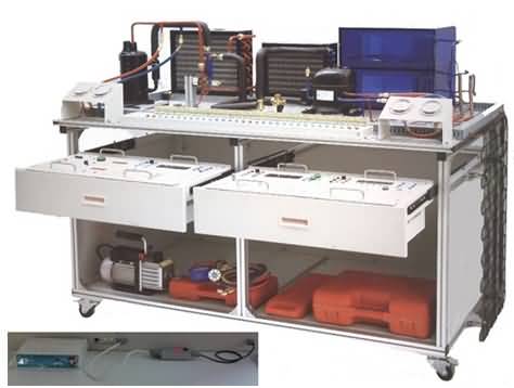 1、实训台采用铝型材台架加实训模块结构,装置采用一体化设计,由导轨式铝合金安装平台、空调系统、电冰箱系统、电气控制系统等组成。底部安装有四个带刹车的脚轮,可以方便的移动和固定。设备配置空调制冷系统管路1套、直冷电冰箱制冷系统管路1套、安全插端子排,压力表(1.5MPa)2只(3.5 MPa)2只等。