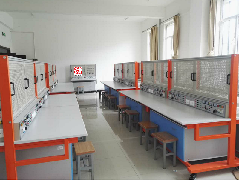 本实训台由实训屏(内置电源)、实训桌、实训储物柜三大部分组成。