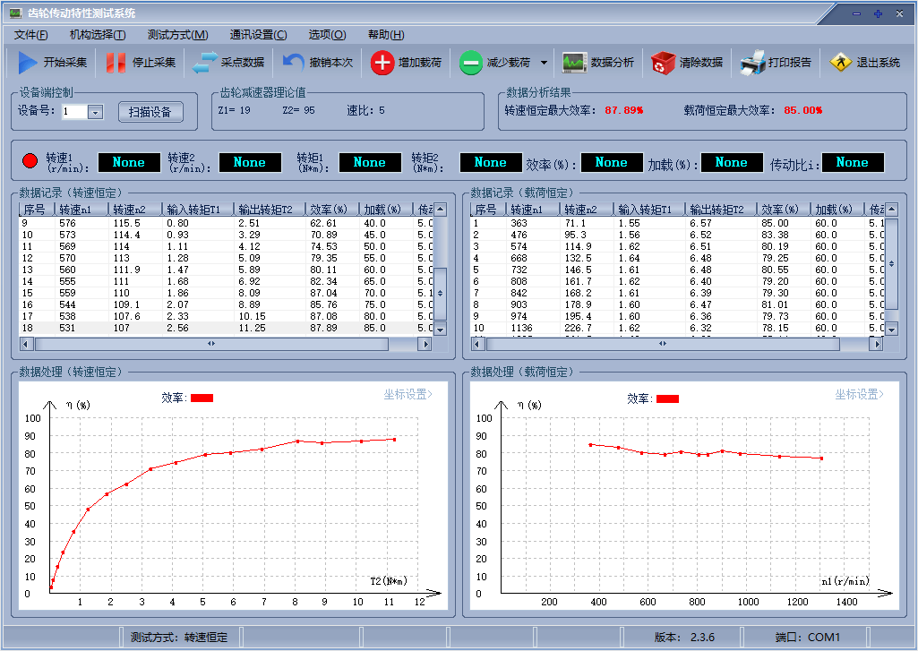 (7) 将载荷设定在某一定值,从小到大(反之亦可)调节输入转速,中间采集数据)8次,点击软件主界面,分析实验结果以及相应的实验曲线(