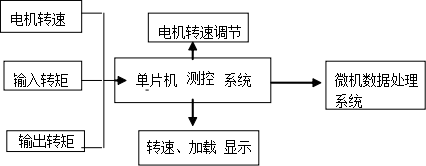 被测蜗杆减速器 为一级蜗杆减速器,其箱体固定在实验台底座上,单头蜗杆减速器传动比i=30(单头蜗杆减速器传动比i=15),其动力输出轴(从动蜗轮轴)上装有磁粉制动器,改变制动器输入电流的大小即改变负载制动力矩的大小。实验台面板上布置或装有电机转速调节旋钮和加载按钮,以及转速和加载显示器件等,电机转速、输入、输出力矩等信号通过单片机数据采集系统输入上位机数据处理后即可显示并打印出实验结果和曲线。实验台原理框图如图所示: