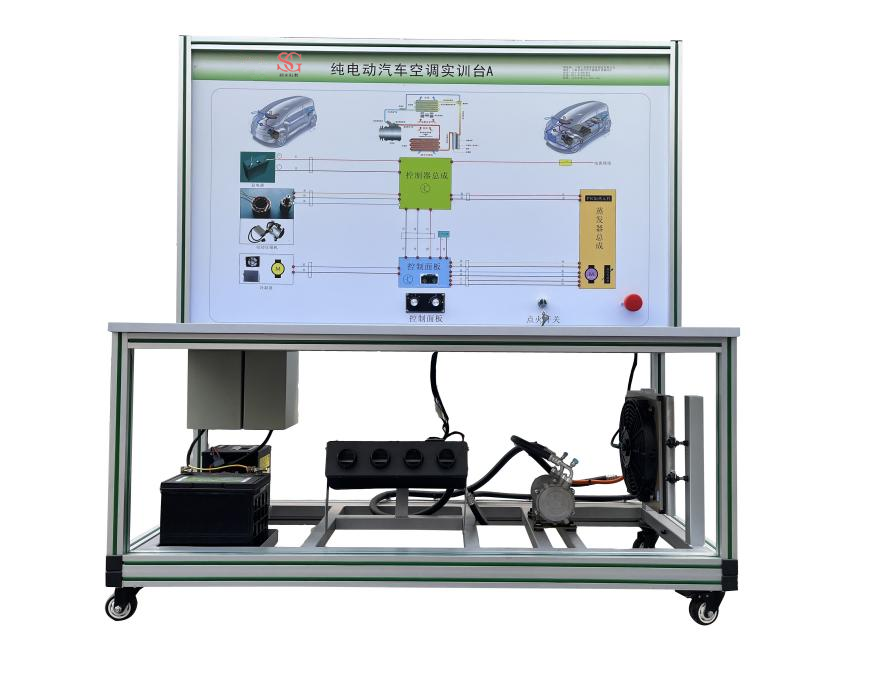 点火开关、电动汽车空调压缩机、膨胀阀总成、干燥器总成、鼓风机总成、冷凝器、冷却电子风扇、电动空调压缩机控制器总成、空调蒸发箱总成、充电器与充电接口、充电插线、DC-DC转换器、锂电池组、空调操作面板、高低压空调压力表、采暖模块总成、电源总开关、急停开关、直流接触器、辅助蓄电池(12V45AH)、一体化全铝合金型材搭建的移动台架(1500×700×1700mm 带自锁脚轮装置,带安装检测端子的原理面板,面板1448×940mm)、故障模拟与排除装置、设备操作说明书。